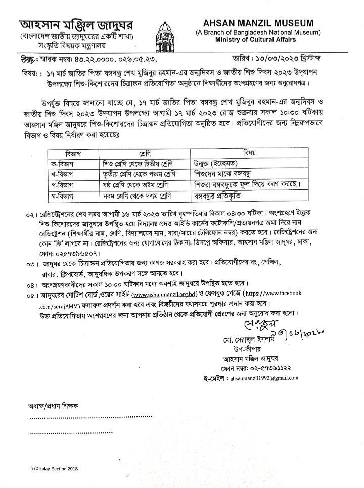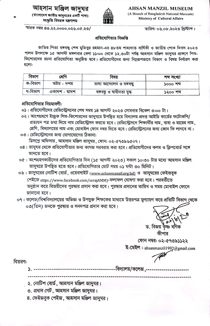 (23) ২৬ মার্চ মহান স্বাধীনতা ও জাতীয় দিবস ২০২৪ উদযাপন উপলক্ষ্যে আহসান মঞ্জিল জাদুঘরে রচনা প্রতিযোগিতার নোটিশ