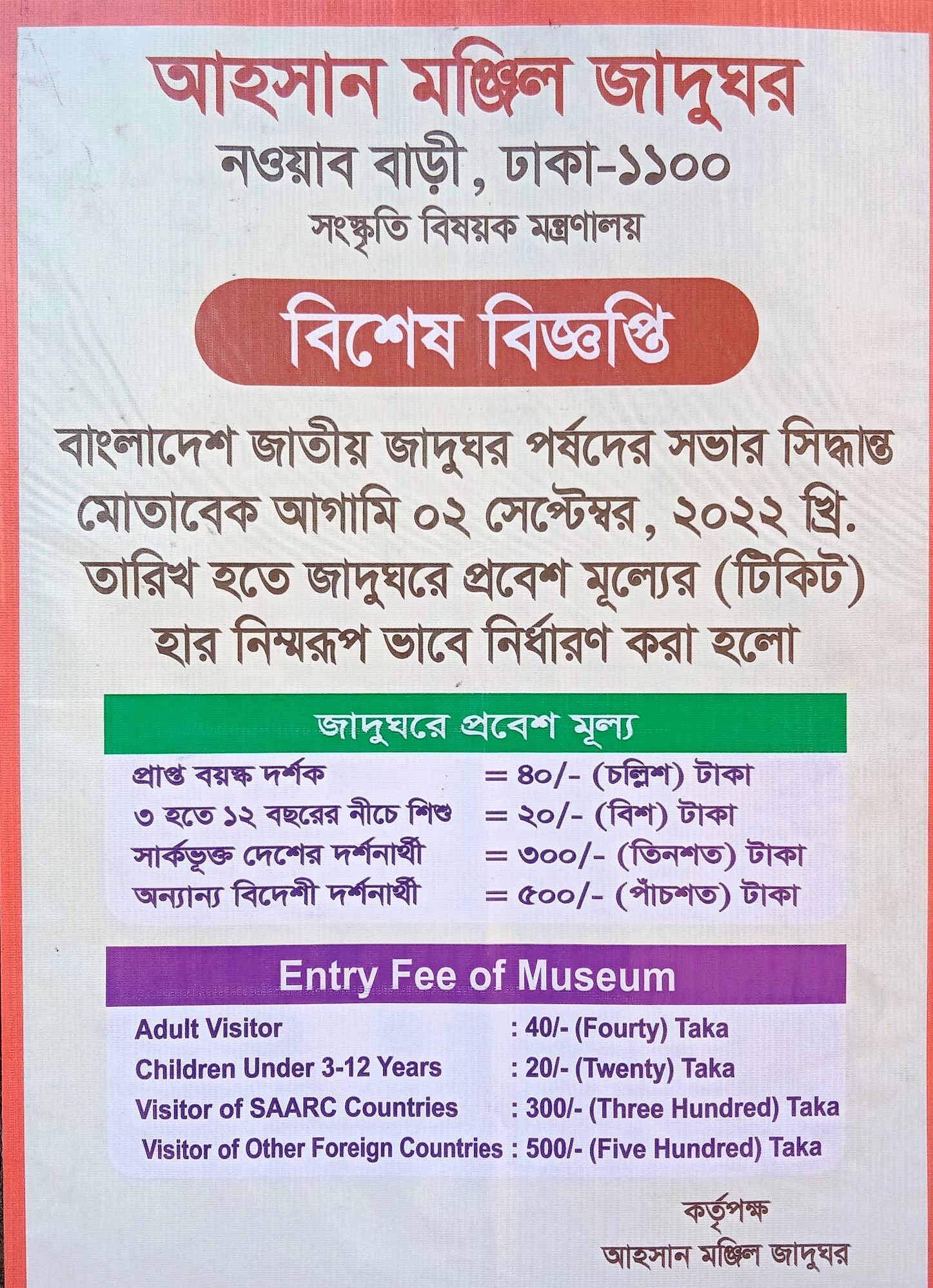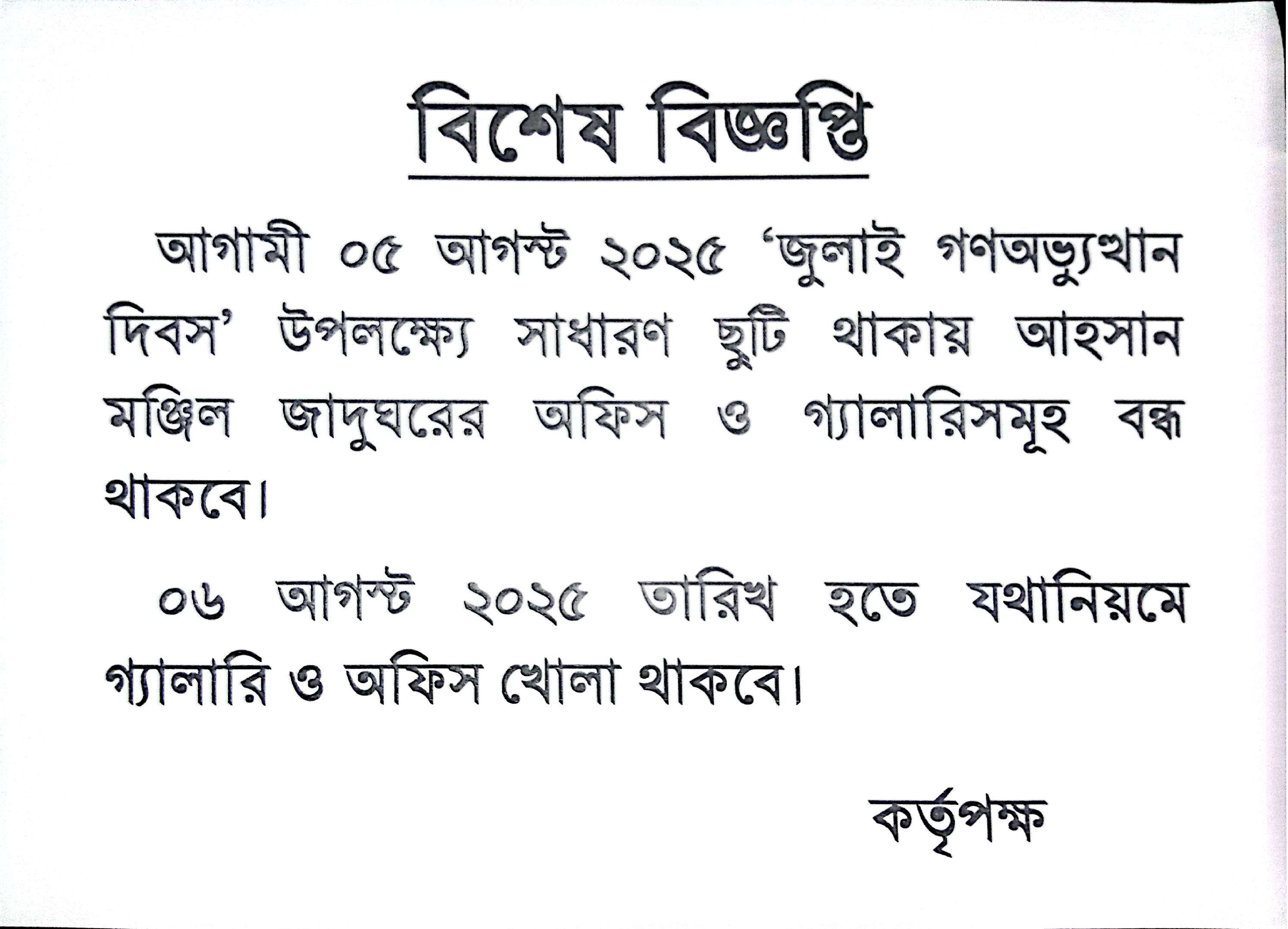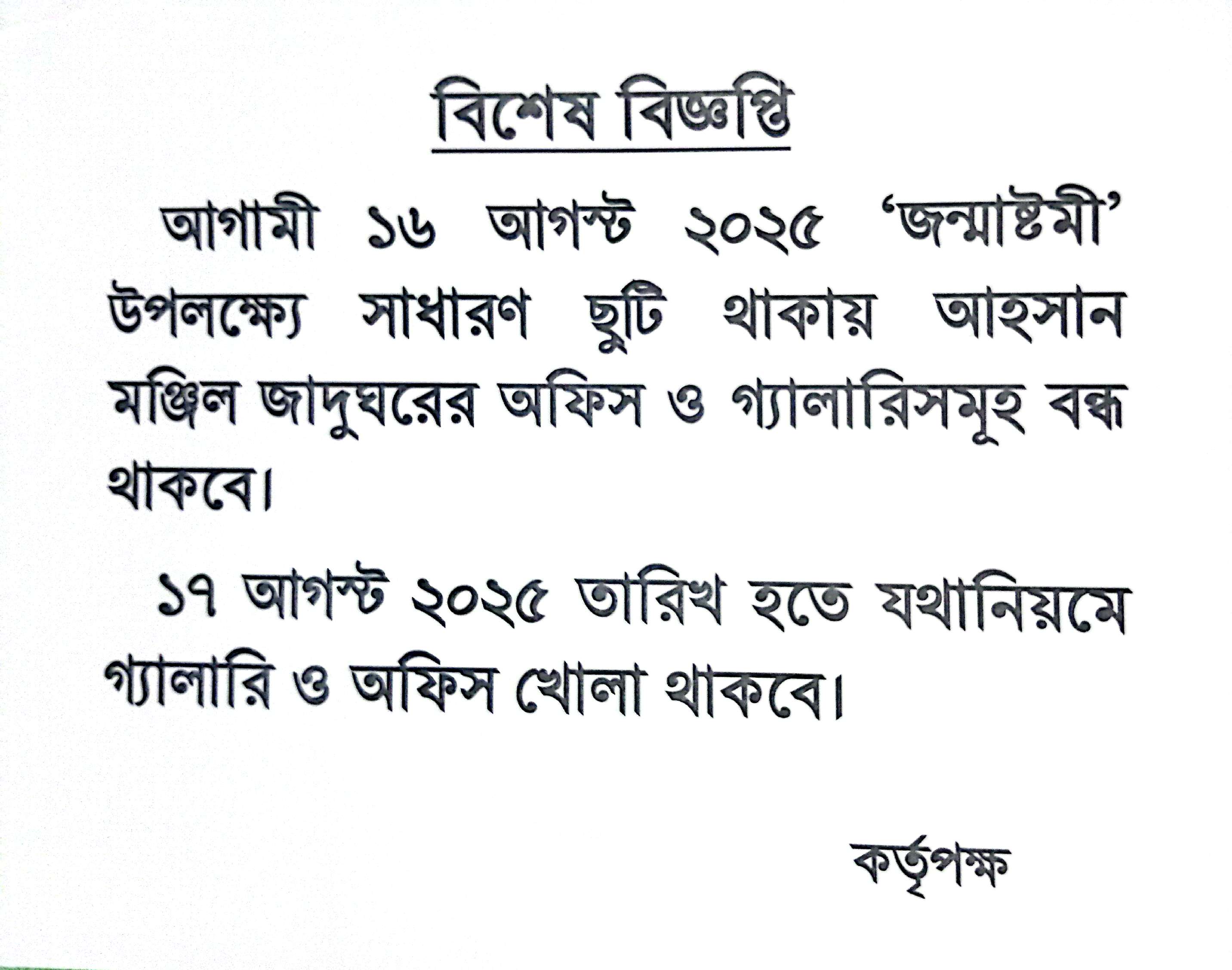 (2) বিশেষ বিজ্ঞপ্তি : আগামী ১৬ আগস্ট ২০২৫ ‘জন্মাষ্টমী’ উপলক্ষ্যে সাধারণ ছুটি থাকায় আহসান মঞ্জিল জাদুঘরের অফিস ও গ্যালারিসমূহ বন্ধ থাকবে। ১৭ আগস্ট ২০২৫ তারিখ হতে যথানিয়মে গ্যালারি ও অফিস খোলা থাকবে।