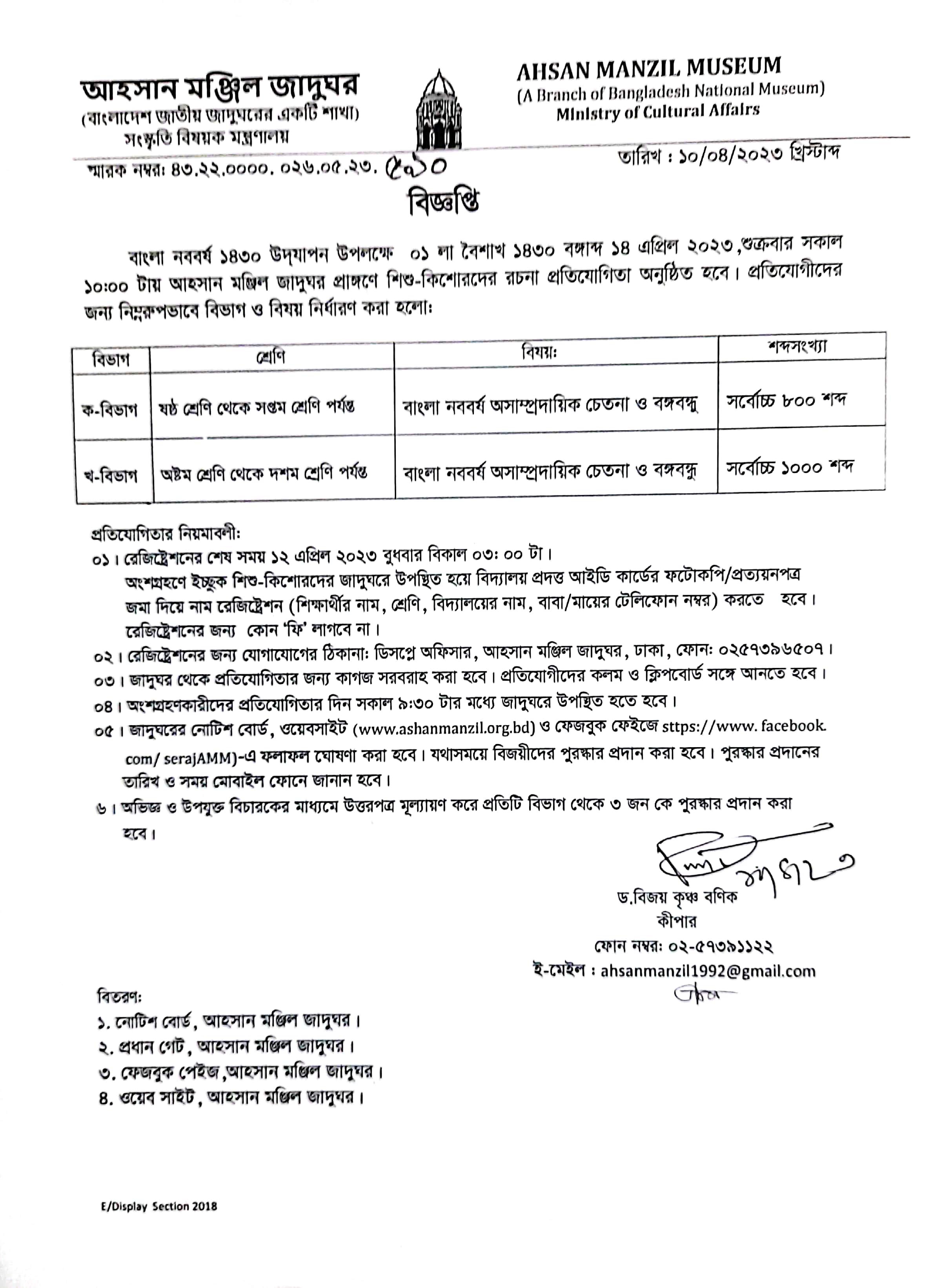 (53) বাংলা নববর্ষ ১৪৩০ উদযাপন উপলক্ষে ০১ লা বৈশাখ ১৪৩০ বঙ্গাব্দ ১৪ এপ্রিল ২০২৩ খ্রিস্টাব্দ রোজ শক্রবার আহসান মঞ্জিল জাদুঘর কর্তৃক আয়োজিত শিশু-কিশোরদের রচনা প্রতিযোগিতার বিজ্ঞপ্তি।