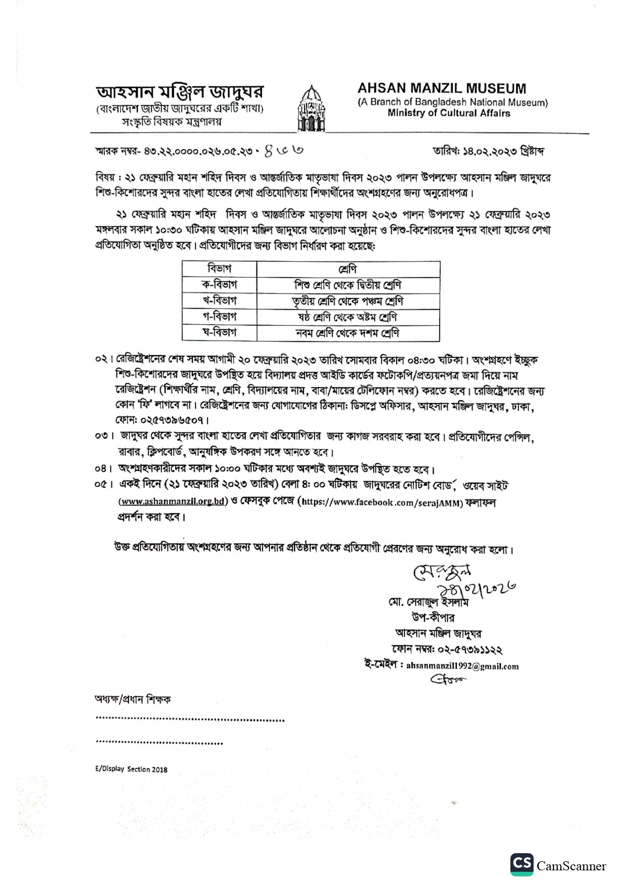 (9) মহান শহিদ দিবস ও আন্তর্জাতিক মাতৃভাষা দিবস উদযাপন উপলক্ষ্যে ২১ ফেব্রুয়ারি শুক্রবার বিকাল ৩.৩০ টা হতে ৪.৩০ পর্যন্ত আহসান মঞ্জিল জাদুঘর প্রাঙ্গণে সুন্দর হাতের লেখা প্রতিযোগিতার বিভাগ নির্ধারণ সংক্রান্ত।