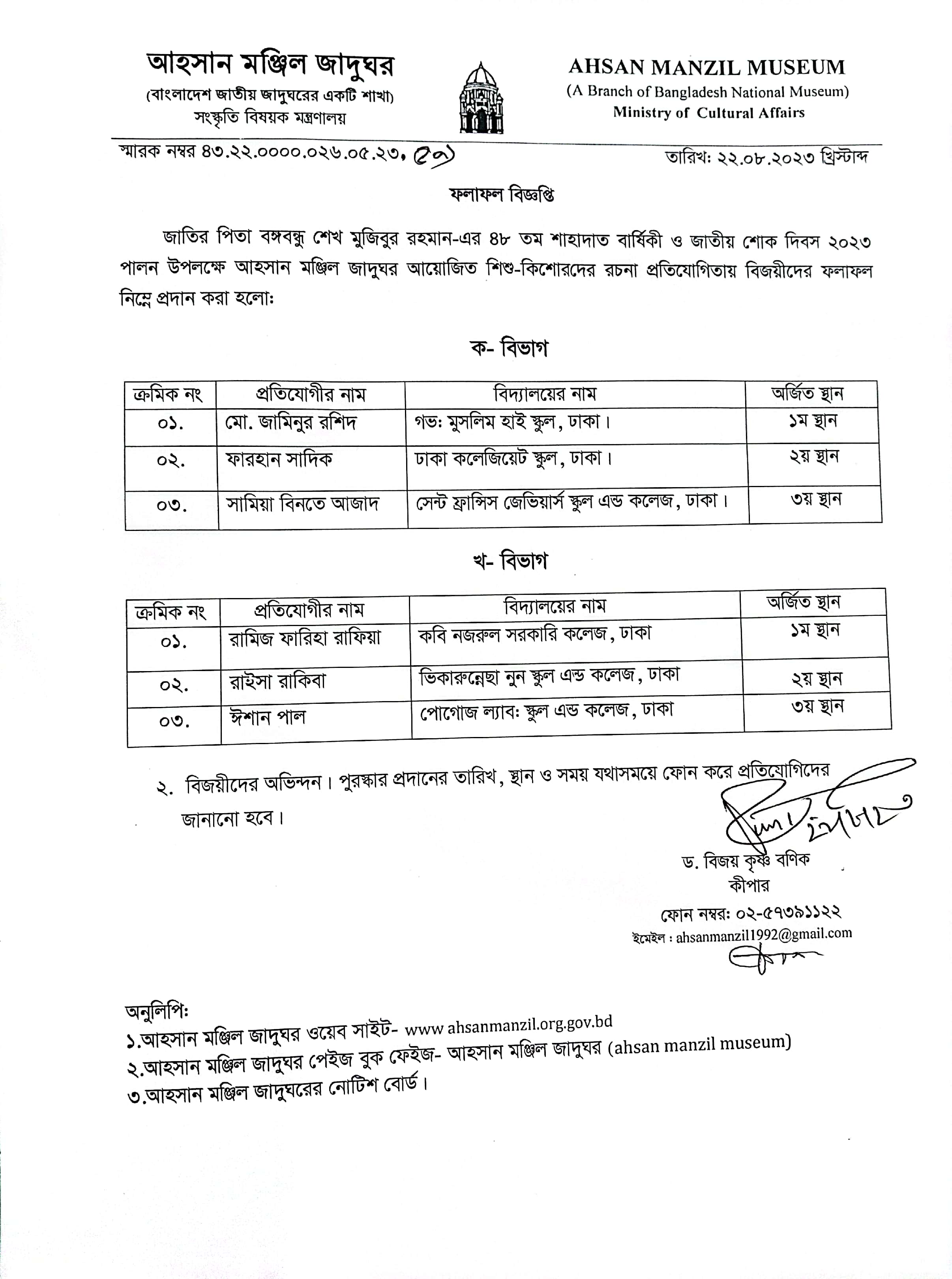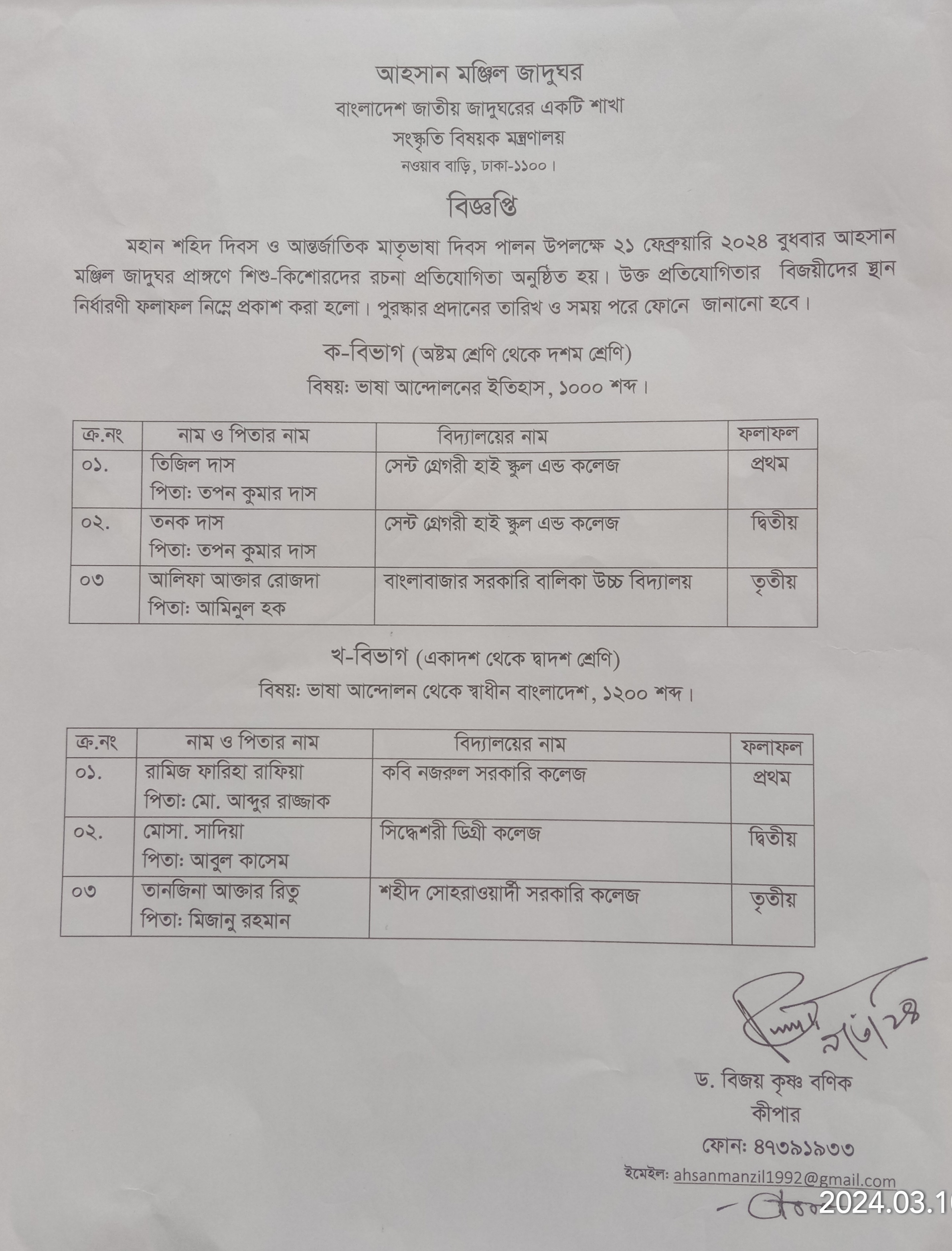 (19) আহসান মঞ্জিল জাদুঘরে অনুষ্ঠিত ২৬ মার্চ ২০২৪ খ্রিস্টাব্দে আয়োজিত প্রতিযোগিতার ফলাফল
