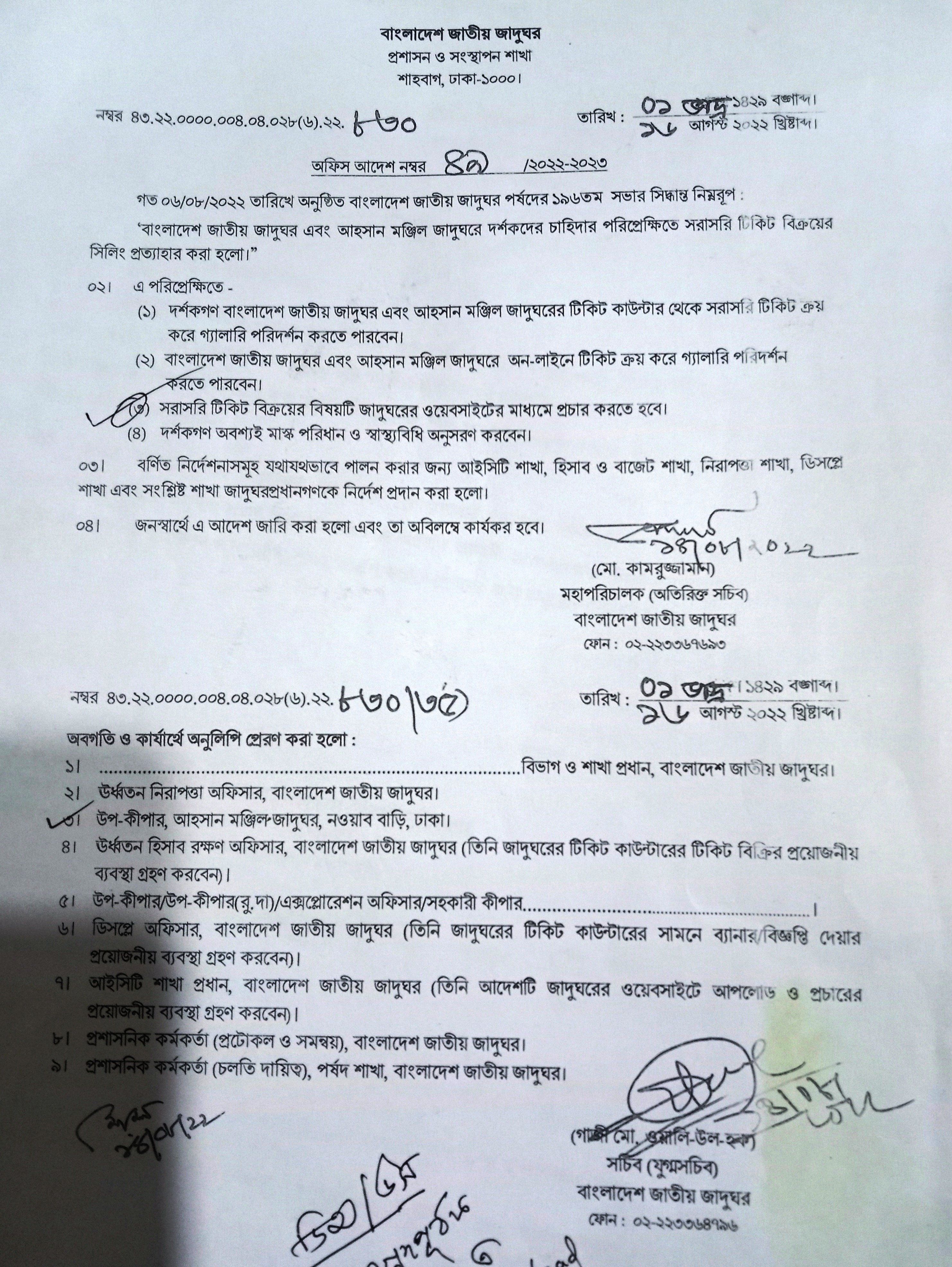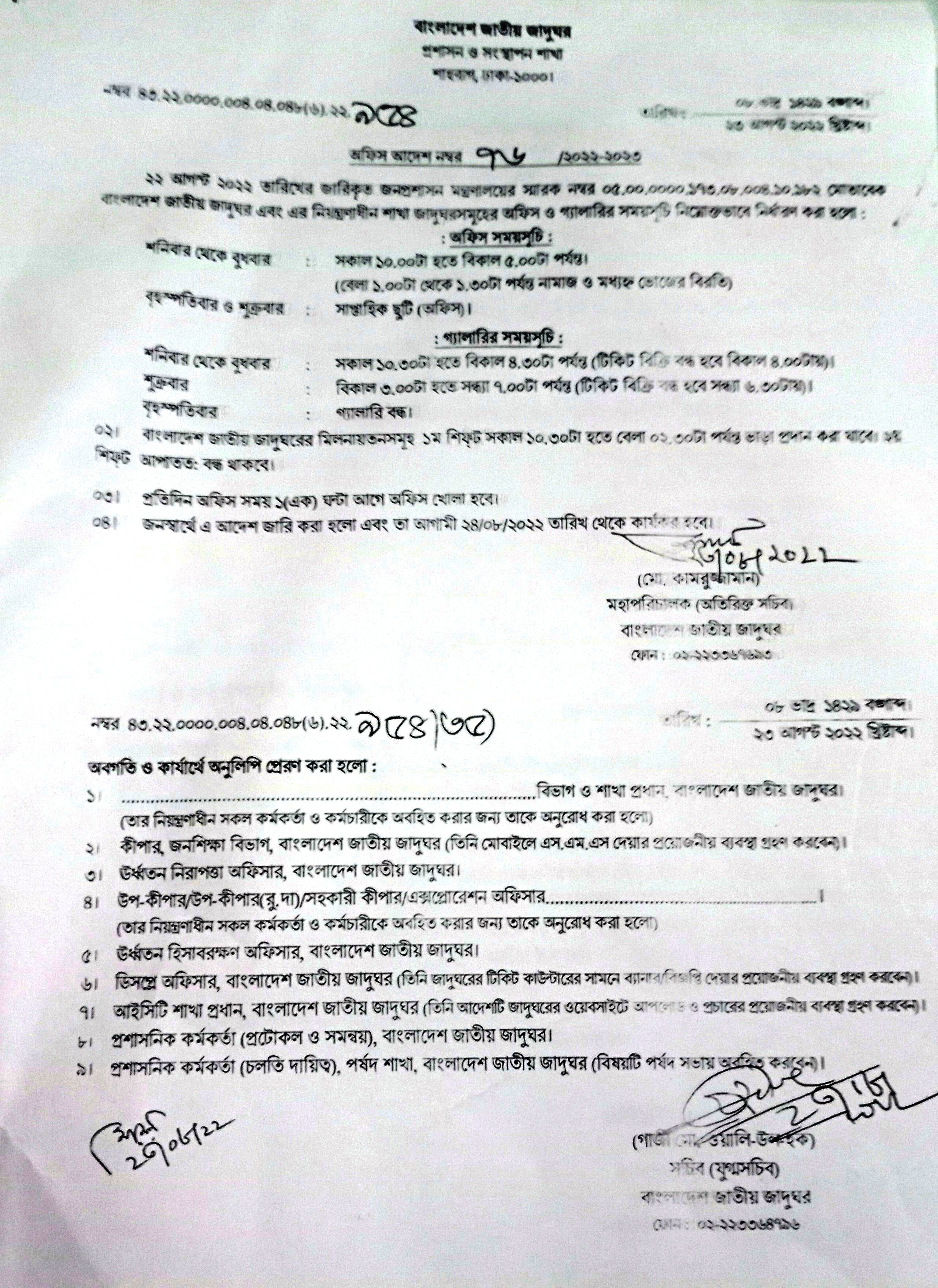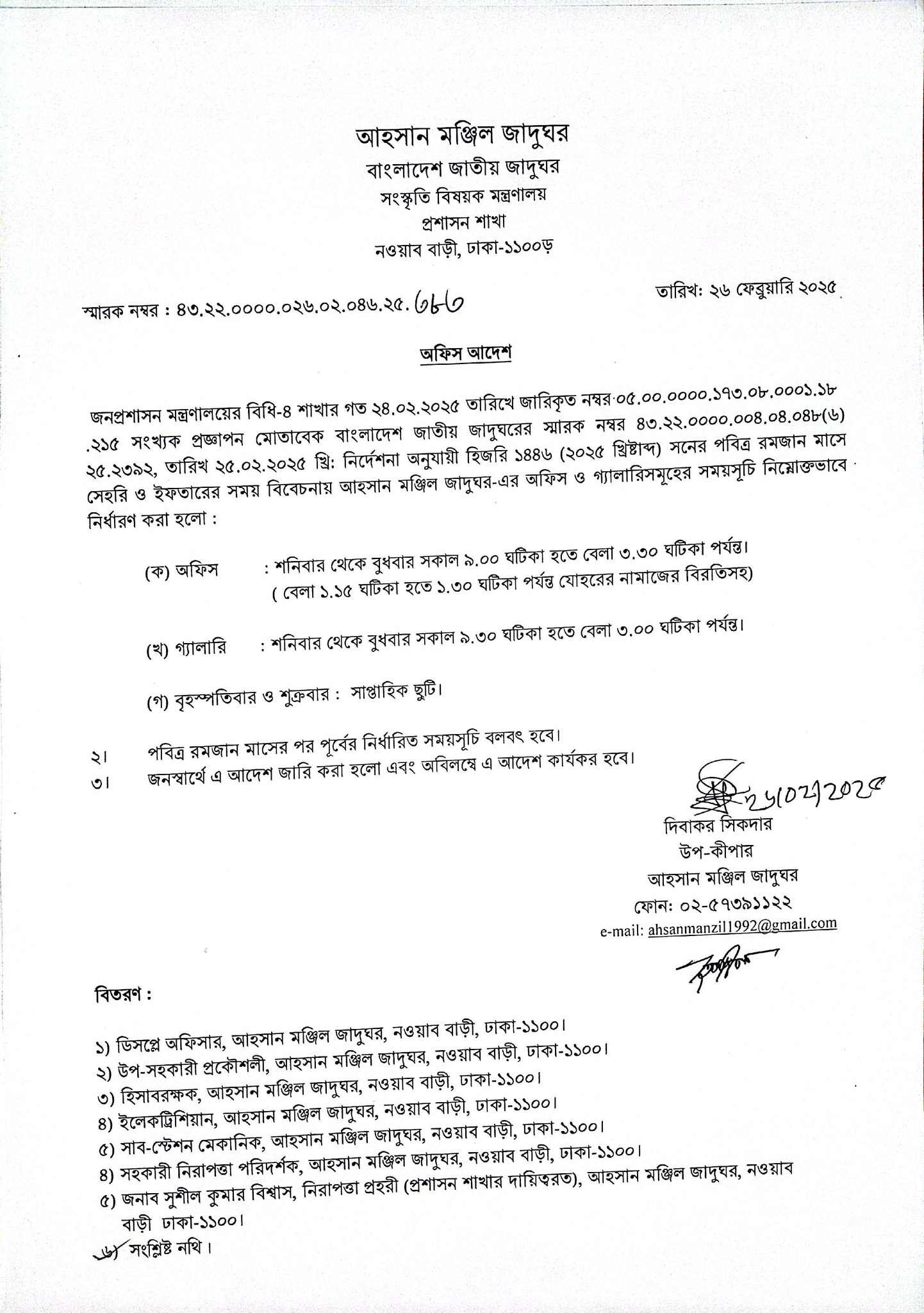 (17) আহসান মঞ্জিল জাদুঘরের অফিস ও গ্যালারির সময়সূচি সংক্রান্ত অফিস আদেশ