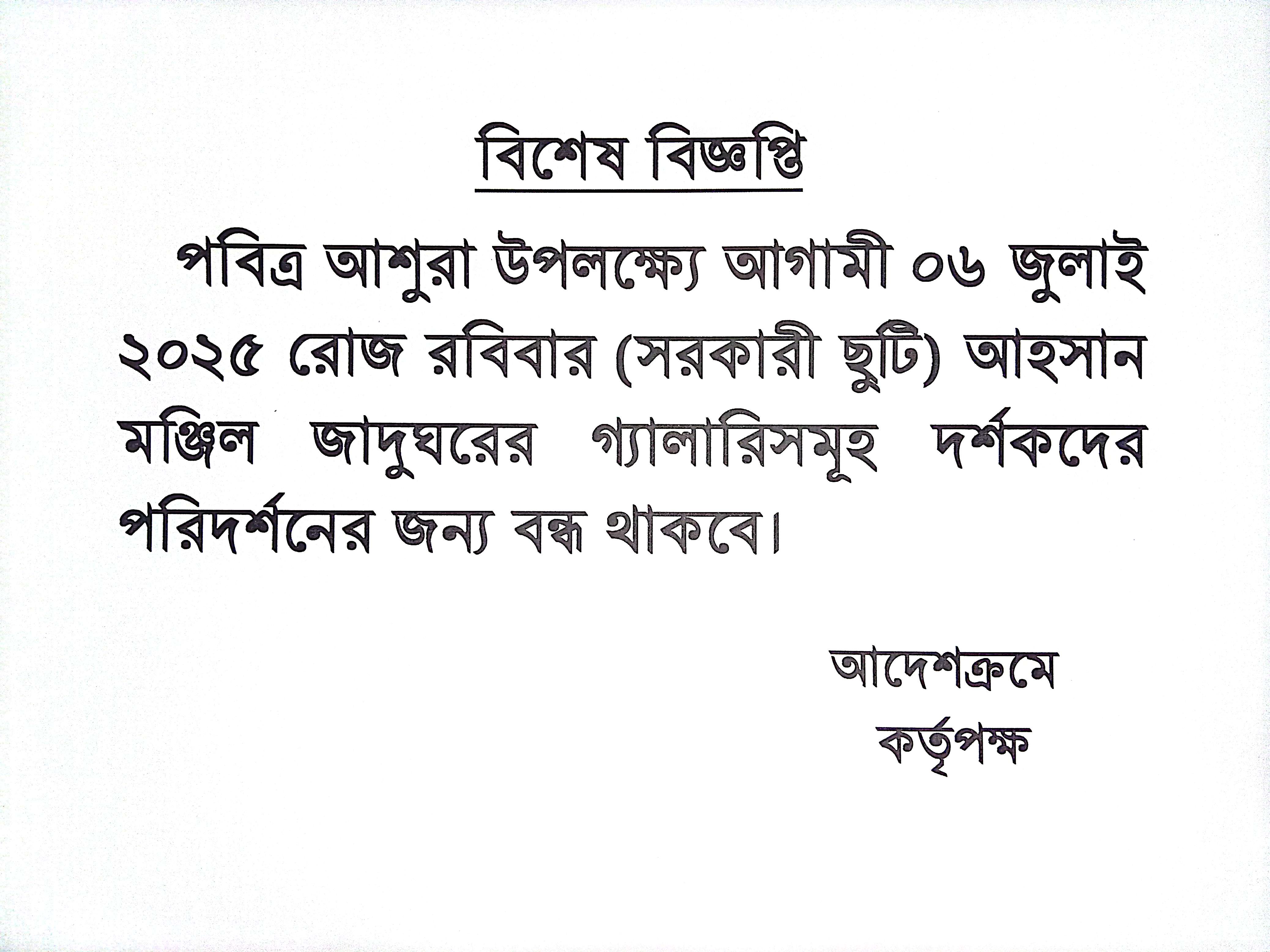 (4) বিশেষ বিজ্ঞপ্তি: পবিত্র আশুরা উপলক্ষ্যে আগামী 0৬ জুলাই ২০২৫ রোজ রবিবার (সরকারী ছুটি) আহসান মঞ্জিল জাদুঘরের গ্যালারিসমূহ দর্শকদের পরিদর্শনের জন্য বন্ধ থাকবে।