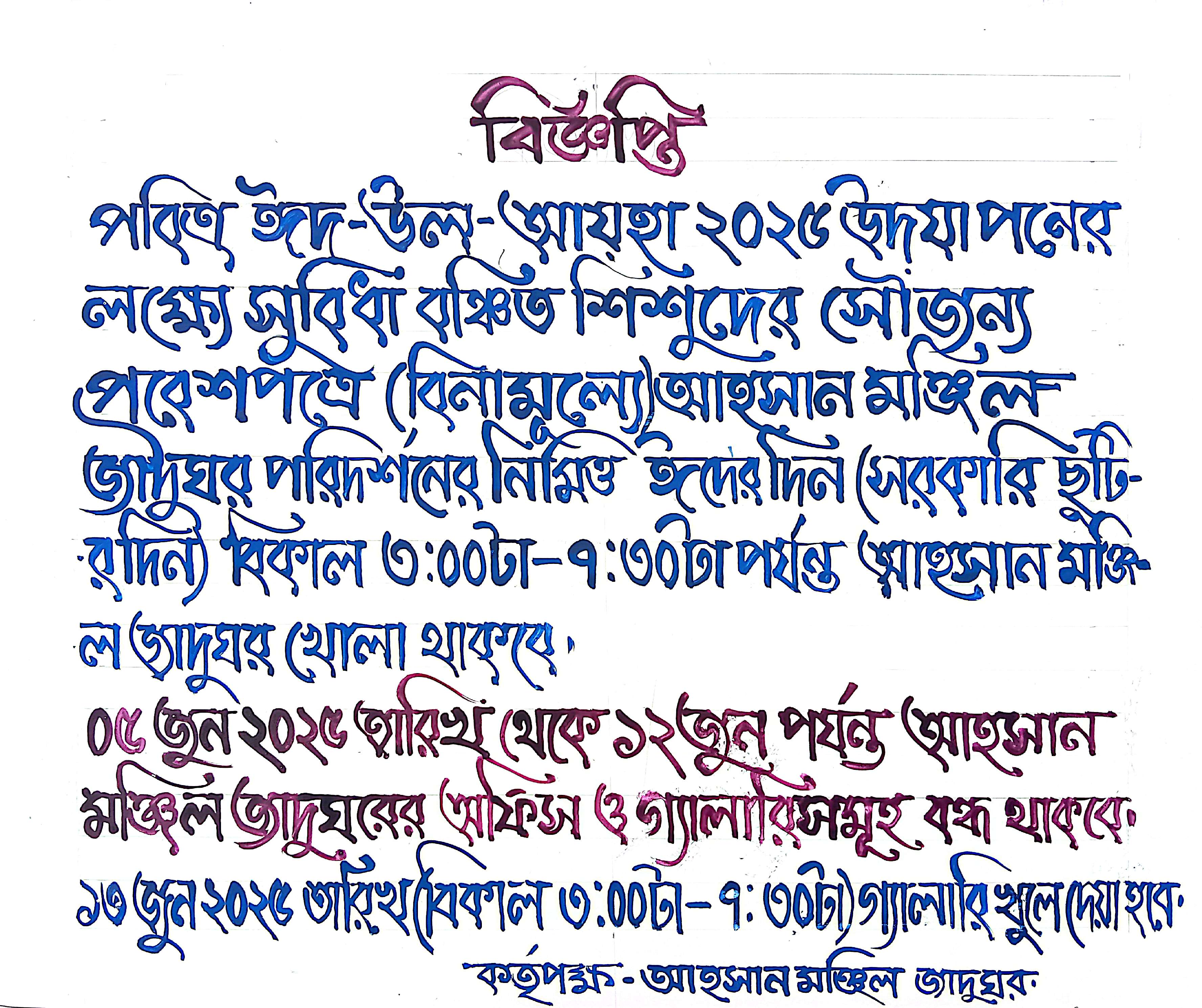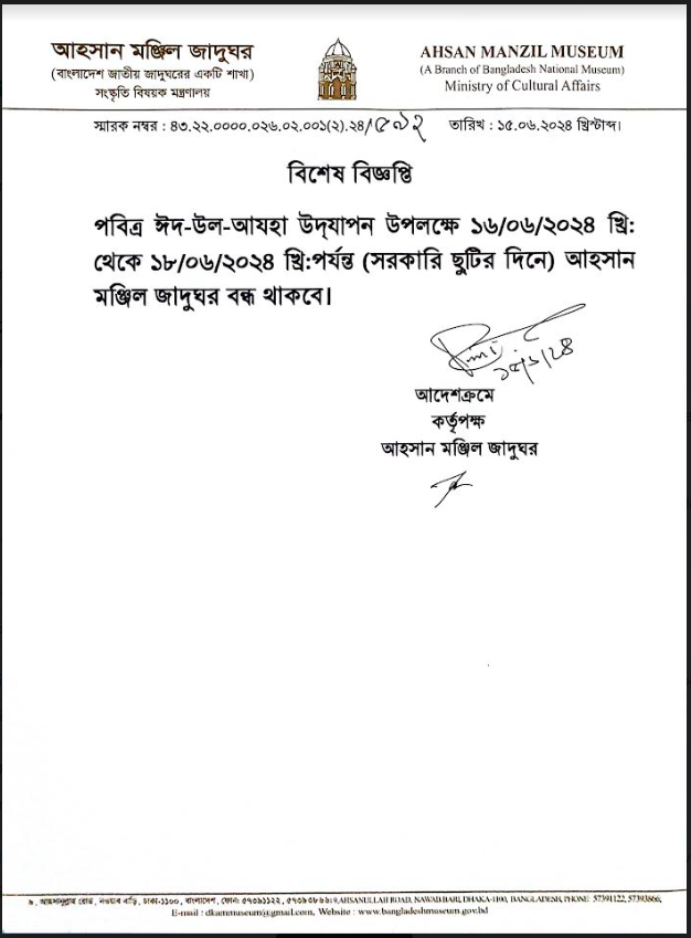 (6) বন্ধের নোটিশ: ০৫ জুন ২০২৫ তারিখ থেকে ১২ জুন ২০২৫ তারিখ পর্যন্ত (ঈদের দিন ব্যতিত) ঈদ-উল-আযহা ২০২৫ উপলক্ষ্যে আহসান মঞ্জিল জাদুঘরের অফিস ও গ্যালারি বন্ধ থাকবে। ১৩ জুন ২০২৫ তারিখ (বিকাল ৩.০০ টা থেকে সন্ধ্যা ৭.৩০টা পর্যন্ত) গ্যালারি খোলা থাকবে।