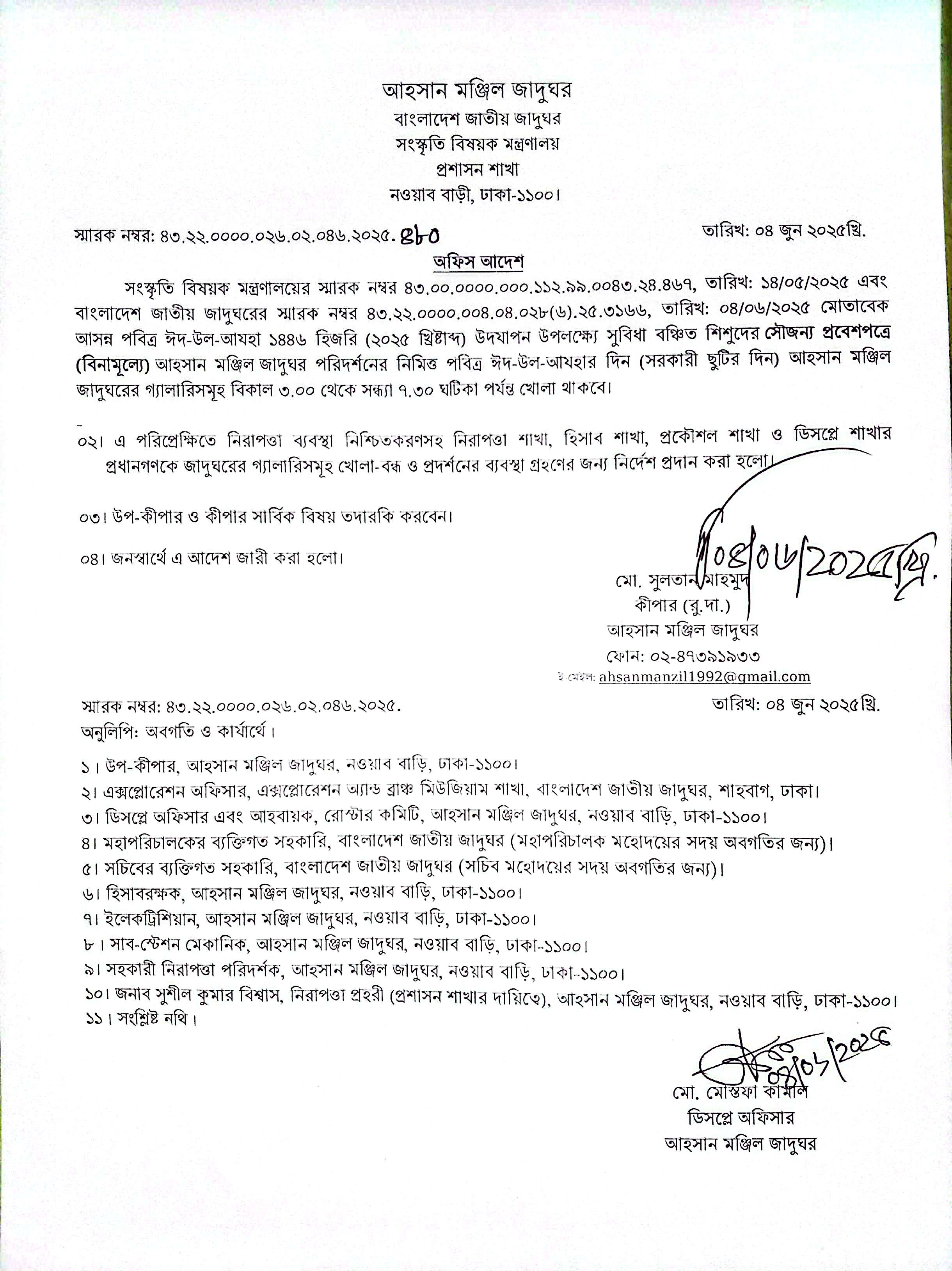 (5) অফিস আদেশ : পবিত্র ঈদ-উল-আযহা ২০২৫ উপলক্ষ্যে আহসান মঞ্জিল জাদুঘরের গ্যালারি ঈদ-উল-আযহা’র দিন বিকাল ৩.০০ টা হতে ৭.৩০ টা পর্যন্ত খোলা সংক্রান্ত।