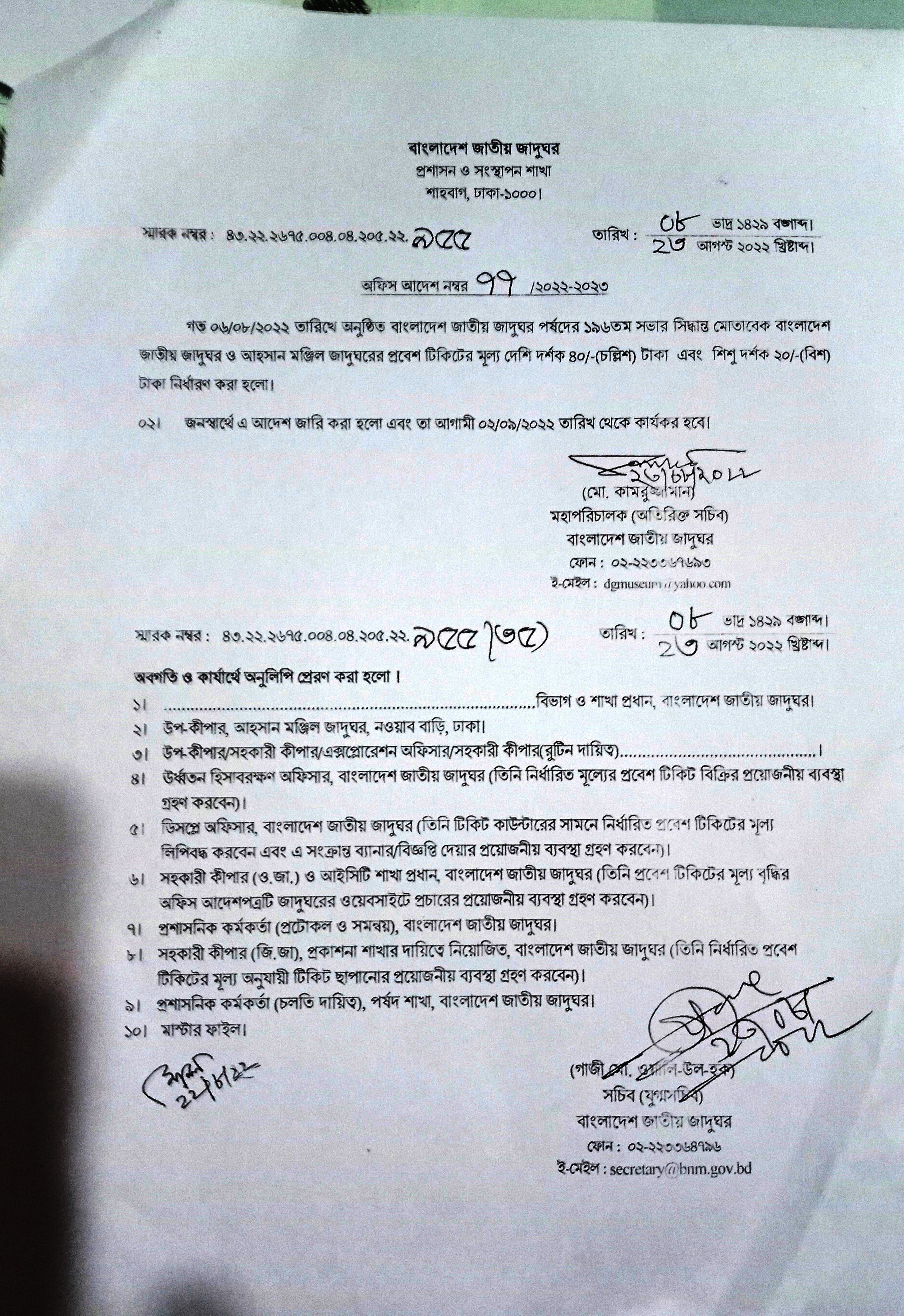 (78) অফিস আদেশ-৭৭, প্রবেশ টিকিটের মূল্য বৃদ্ধি বিষয়ক, ২০২২
